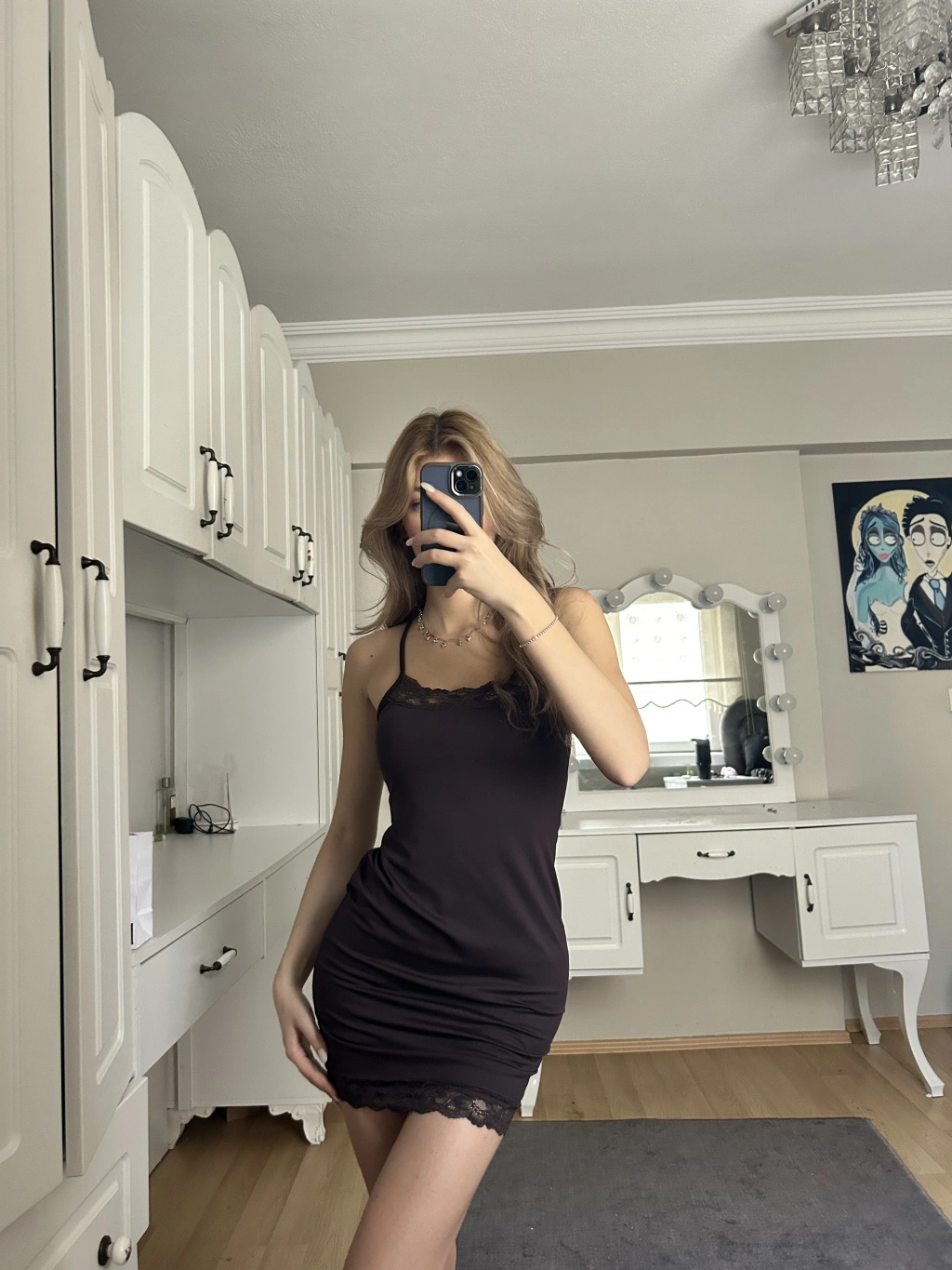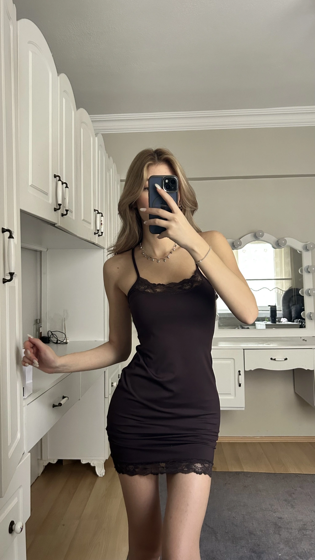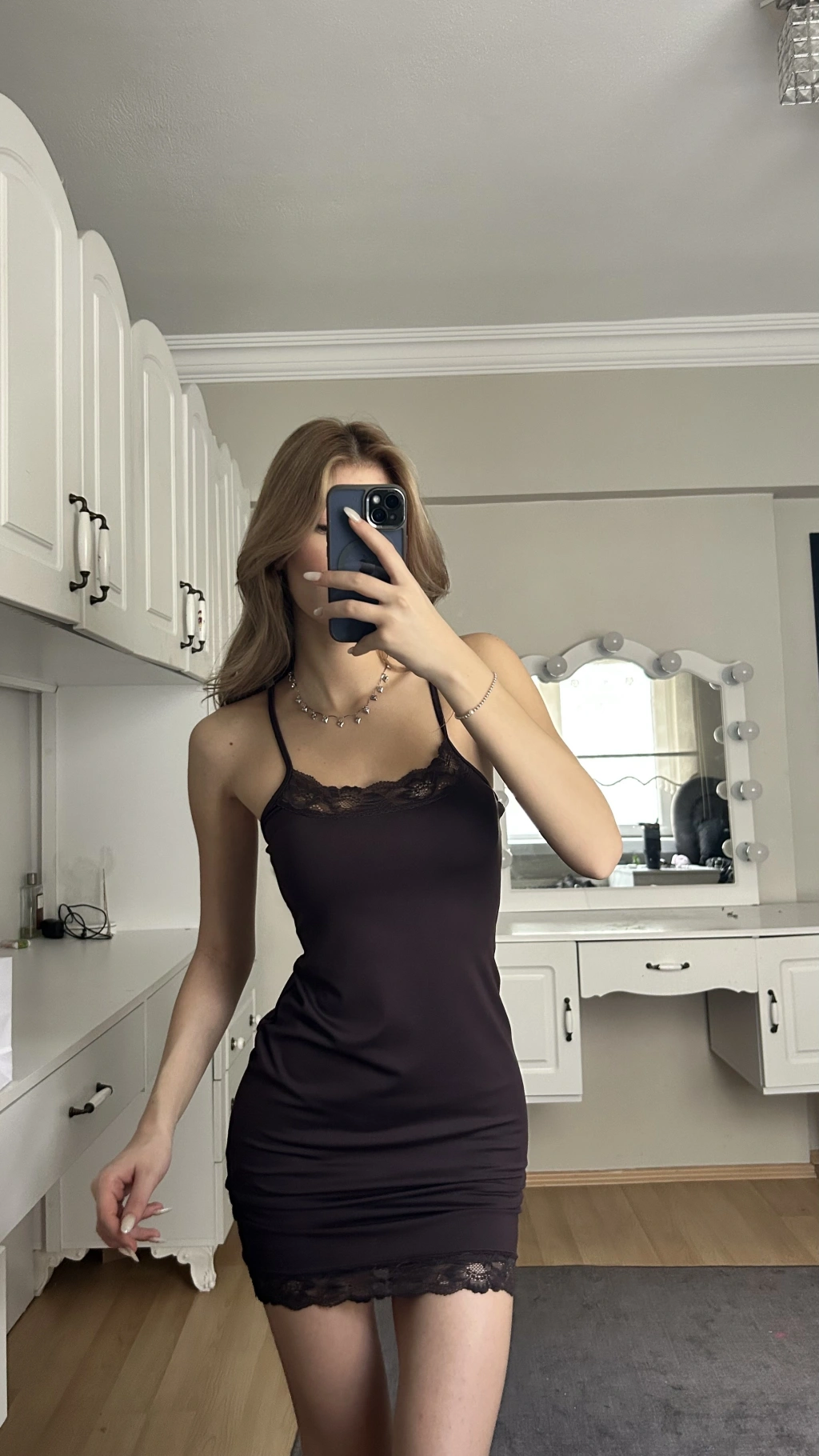 Kahverengi Askılı Dantelli Elbise