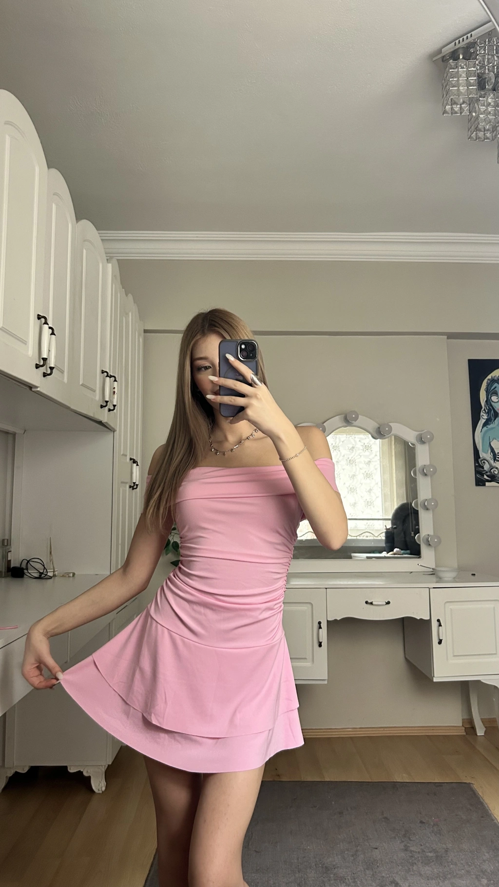 Pembe Askılı Sırt Detay Prenses Elbise