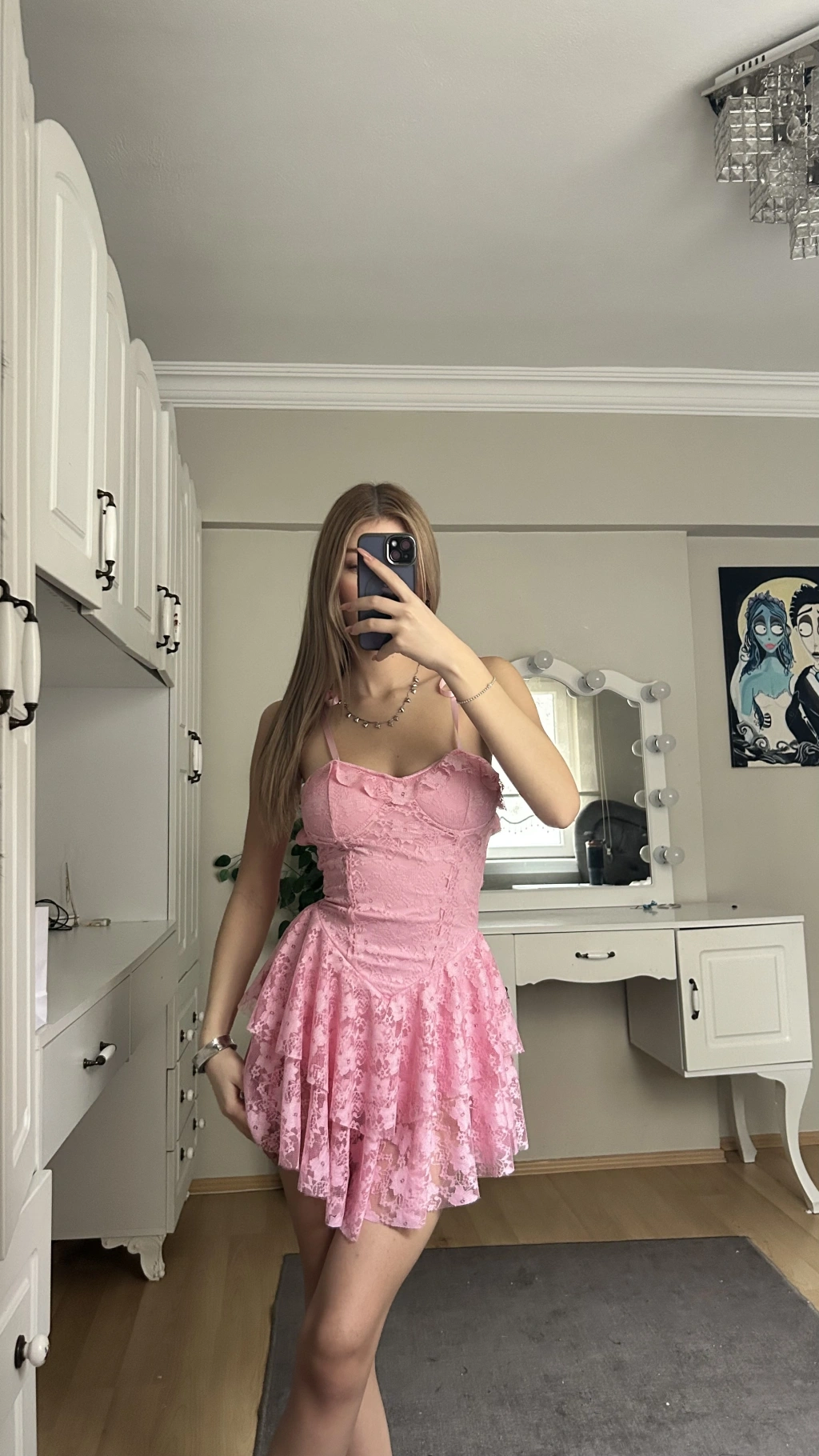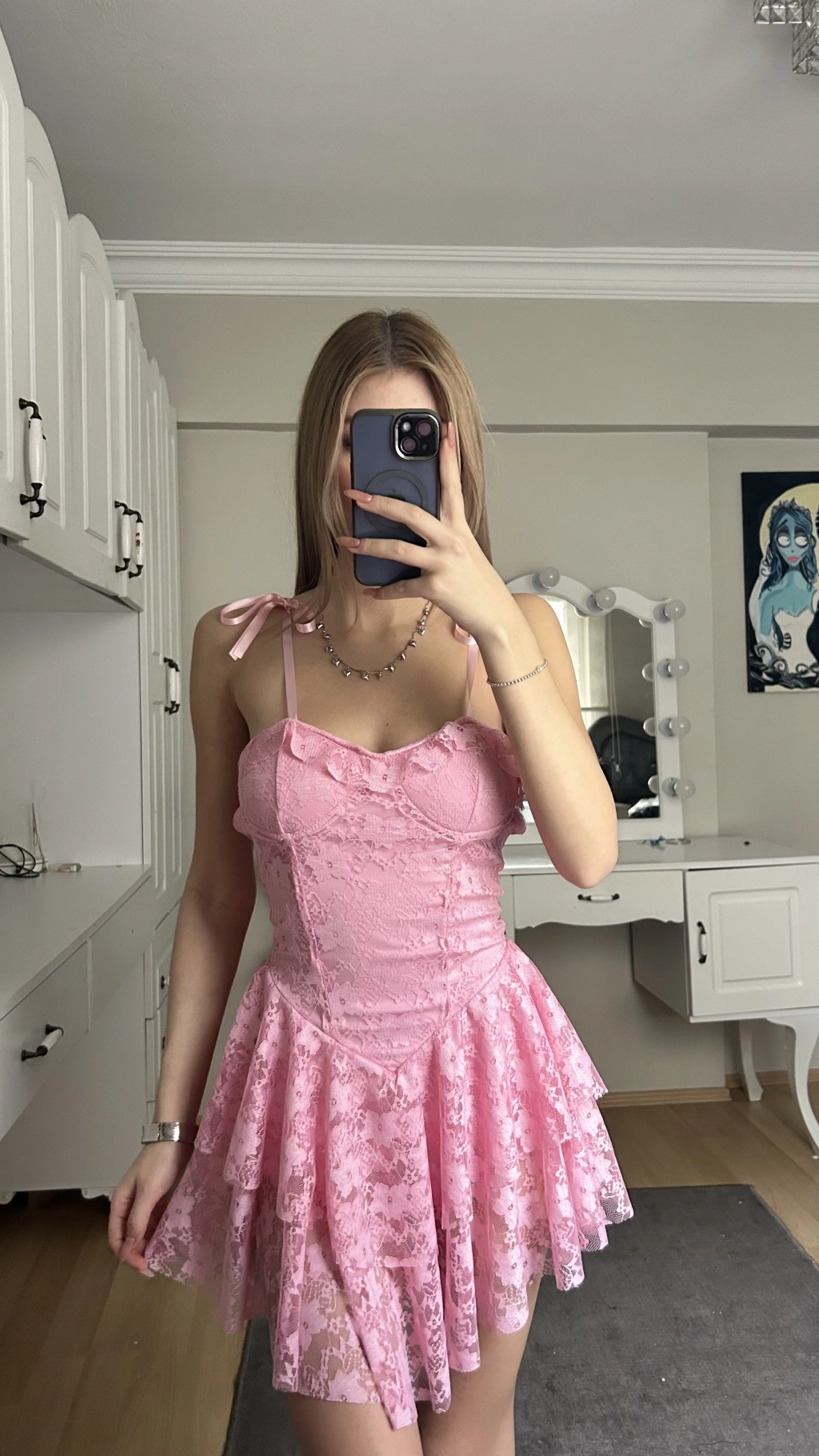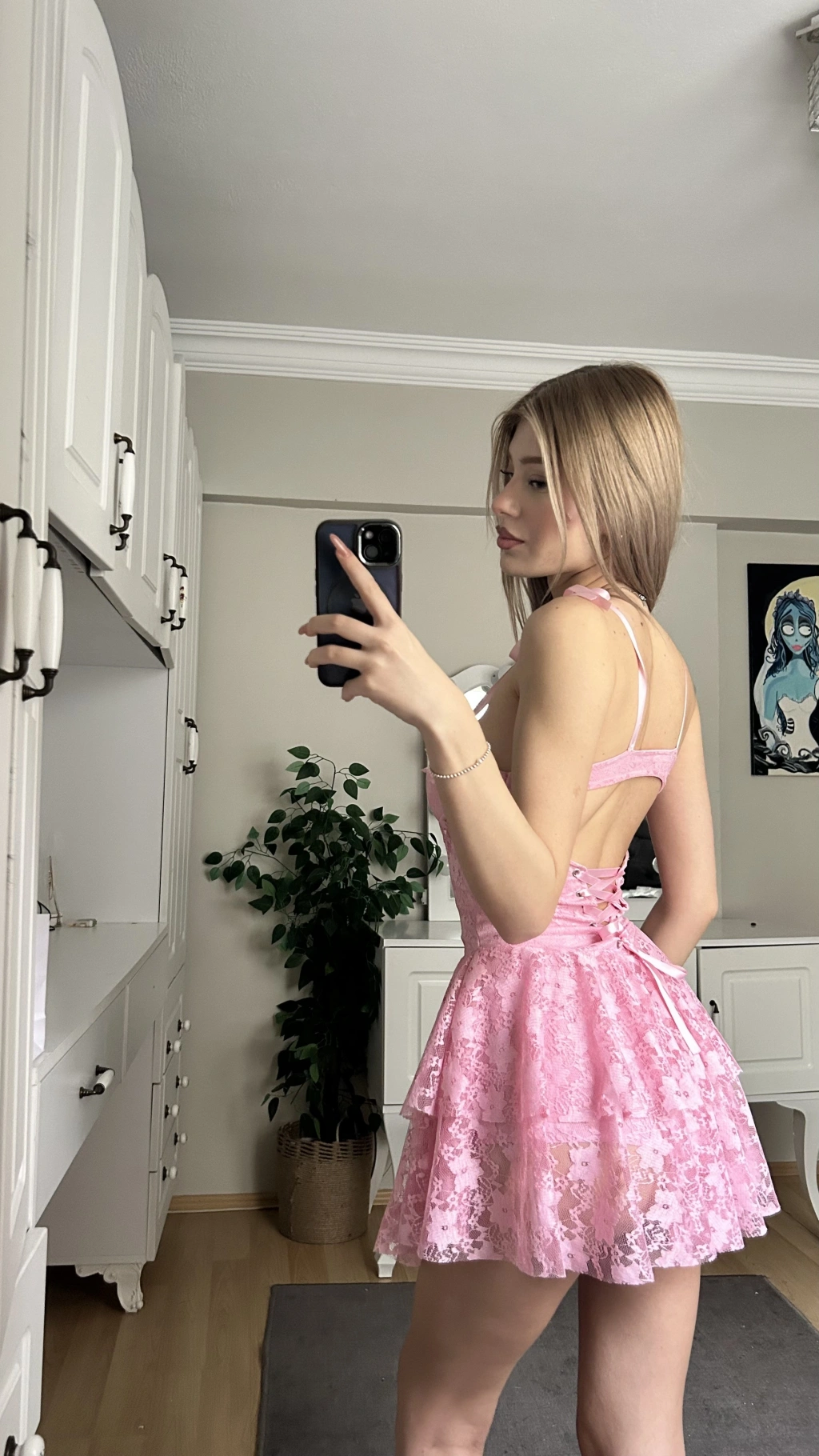 Pembe Askılı Sırt Detay Prenses Elbise